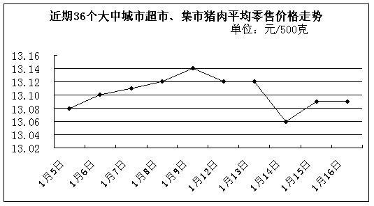 中新網(wǎng)1月19日電 據(jù)國家發(fā)展改革委價(jià)格監(jiān)測中心監(jiān)測,上周(1月12日-1月16日)36個(gè)大中城市超市、集市豬肉(精瘦肉)平均零售價(jià)格每500克為13.10元,比前一周(1月5日-1月9日,下同)下降0.08%。