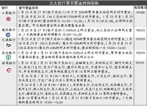 從各行公布的春節(jié)網(wǎng)點(diǎn)營(yíng)業(yè)安排來(lái)看,春節(jié)假期銀行網(wǎng)點(diǎn)均縮短了每日的營(yíng)業(yè)時(shí)間,大致改為10:00至16:00。