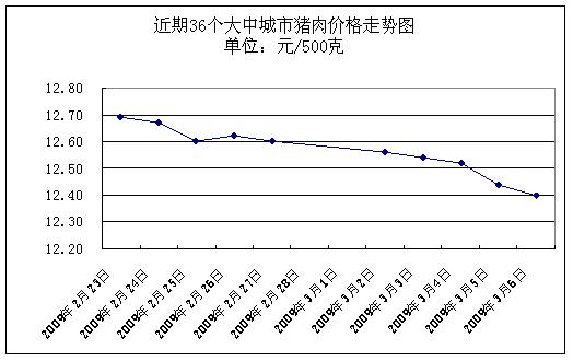 中新網(wǎng)3月9日電 據(jù)國(guó)家發(fā)改委網(wǎng)站消息,據(jù)國(guó)家發(fā)展改革委價(jià)格監(jiān)測(cè)中心監(jiān)測(cè),上周(2009.3.2-2009.3.6,下同)全國(guó)36個(gè)大中城市集市、超市豬肉(精瘦肉)平均零售價(jià)格每500克為12.49元,與前一周(2009.2.23-2009.2.27,下同)相比下降1.19%。