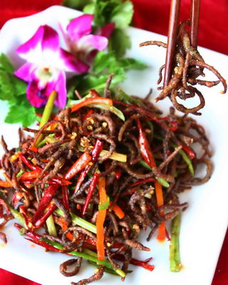 說起蚯蚓這種扭曲的小蟲,你的第一反應(yīng)也許是肥美的魚餌。不過,金堂趙鎮(zhèn)的一家農(nóng)家樂,卻把蚯蚓擺上餐桌,經(jīng)過油炸、爆炒,成為其招牌菜——“干煸地龍”,售價(jià)98元一份。這道有些古怪的菜品,吸引了不少獵奇的食客。昨日,記者走進(jìn)這家農(nóng)家樂的廚房,一探究竟。