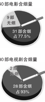 從2007年開始,中國控?zé)焻f(xié)會每年都會對熱播的國產(chǎn)影視劇中的吸煙鏡頭進行監(jiān)測統(tǒng)計。對2009年熱播的40部電影和30部電視劇進行的監(jiān)測結(jié)果顯示:在40部電影中有9部電影完全沒有煙草鏡頭,31部影片有煙草鏡頭,占影片的77.5%;30部電視劇中,2部沒有煙草鏡頭,28部有煙草鏡頭,占電視劇比例的93%。
