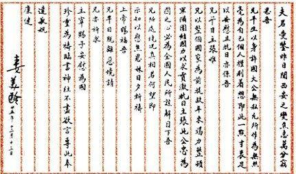 兄不自檢束,竟遭不測之禍,致令至愛憂傷,罪何可言。今事既至此,惟有不愧為吾妻之丈夫,亦不愧負吾總理與吾父吾母一生之教養(yǎng),必以清白之身還我先生,只求不愧不怍無負上帝神明而已。家事并無掛念,惟經(jīng)國與緯國兩兒皆為兄之子,亦即吾妻之子,萬望至愛視如己出,以慰吾靈。經(jīng)兒遠離十年,其近日性情如何,兄固不得而知;惟緯兒至孝知義,其必能克盡孝道。彼于我遭難前一日尚來函,極欲為吾至愛盡其孝道也。彼現(xiàn)駐柏林,通信可由大使館轉(zhuǎn)。甚望吾至愛能去電以慰之為感。