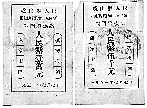 ?谀壬依锉4嬷鴥蓮埈偵娇h發(fā)動(dòng)百姓向志愿軍捐款,購(gòu)買“瓊山人民號(hào)”飛機(jī)的證明捐款票證。 沈善東 攝