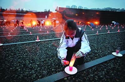 “我們共風雨,我們共追求,我們珍存同一樣的愛,無論你我可曾相識,無論在眼前在天邊,真心的為你祝福……”昨日18時許,侵華日軍南京大屠殺遇難同胞紀念館集會廣場上燭光點點,在南京和平鴿藝術團的孩子們清純的歌聲中,2010年度“和平”活動拉開了帷幕。當晚,來自江東門小學的藝術團員們和來自俄羅斯、泰國、日本等地的國際友好人士,以及北京、沈陽、福建等地兄弟場館的負責人一起,在象征“和平之舟”的船頭上,點亮了代表悼念30萬遇難同胞的3000支紅燭,表達了對逝者的懷念,對世界和平的熱愛、珍視和期盼。 宋嶠 文/攝