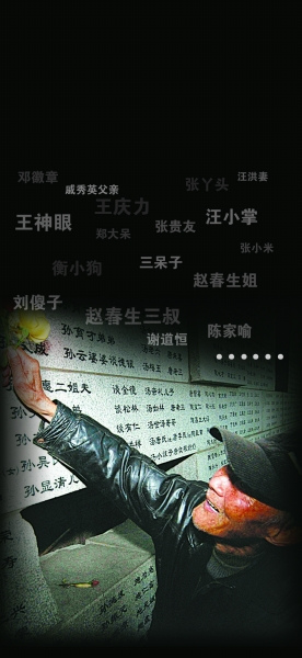 記者拿到部分即將刻上“哭墻”的姓名,發(fā)現(xiàn)有的遇難者無(wú)姓也無(wú)名,比如三呆子、二道標(biāo)等;有的有姓但無(wú)名,比如劉傻子、王老二、許小四等;還有的只是某某人親戚,比如趙春生三叔、趙春生姐、戚秀英父親、龐世昌哥哥等。