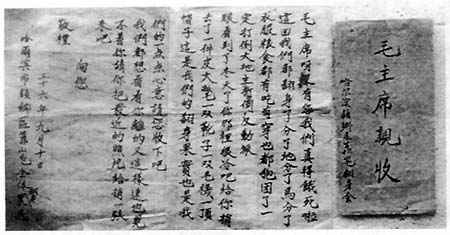 1947年秋天,毛澤東收到了來自哈爾濱顧鄉(xiāng)區(qū)靠山屯的一封信。信紙為十六開,共兩頁。信封上寫著:毛主席親收。信中寫道:“毛主席呀,沒有您我們真得餓死啦!這回我們都翻身了,分了地,分了馬,分了衣服、糧食,都有吃有穿也都抱團了。眼看到了冬天了,你那里很冷吧。給你捎去了一件皮大氅,一雙靴子,一雙毛襪,一頂帽子。這是我們的翻身果實,也是我們的一點點心意,請您收下吧。我們都想看看你,離得又這樣遠,也見不著你,請你把最近的照片給捎一張來吧!辟|樸淳厚的語言,說出了老百姓掏心窩子的話。(《黨史博采》2007年第9期)