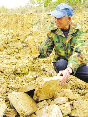 在施工現(xiàn)場(chǎng),包括一座漢墓在內(nèi),至少有兩座墓葬在強(qiáng)大的挖掘機(jī)的“發(fā)掘”下,已經(jīng)慘不忍睹,只剩少許破碎的青磚,讓人依稀感到這里曾是座古墓。所幸的是,發(fā)現(xiàn)大青磚的那座六朝墓還沒(méi)有被掘毀,從挖掘機(jī)挖開(kāi)的斷面上看,青磚雖沒(méi)有六朝大墓那么大,同時(shí)因還沒(méi)有進(jìn)行正式發(fā)掘,尚不知該墓的具體規(guī)模。但目前已經(jīng)暴露的墓磚較大,尤其還發(fā)現(xiàn)了上下寬度不同的梯形磚,因此顯然也不是平民之墓。據(jù)專家推測(cè),這里很有可能是那座六朝大墓主人的親屬之墓。