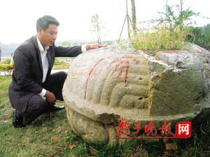 記者看到,這尊“赑屃”石刻沒有頭,根據風化程度推測,頭部大約是在100年前脫落的,身上馱的墓碑也不見了,原來插碑的地方雜草叢生,倒是滿身的形似龜殼的立體花紋細膩清晰,經歷了600多年的歲月,原來裸露在地面的上面10厘米部分呈黑色,下面灰色的部分是常年被埋在土里的。有趣的是,“赑屃”身上有許多紅色油漆,乍一看很像是它流的血。中山陵園管理局文物處專家路侃介紹,這是石頭風化過程中油漆滲透到里面,造成了這種效果。