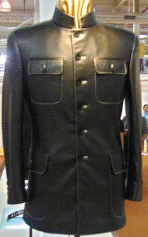 昨天下午,記者現(xiàn)場看到,該展區(qū)的中山裝除了傳統(tǒng)的老款式外,還包括了很多新穎的款式,例如,用香云紗、皮料制作的中山裝,用意大利進口面料制作的中山裝……