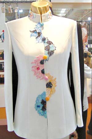 有一款中山裝制作最為新潮,衣領圖案是奧運五環(huán),前襟圖案則是一條飛龍,如果仔細觀察可以發(fā)現(xiàn),該條飛龍是用類似奧運福娃的局部圖案巧妙地拼接而成的。