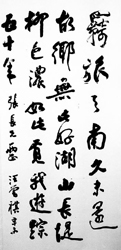 那天,他乘酒興一口氣給我留下兩幅字。其中一幅是這么寫的:“羈旅天南久未還,故鄉(xiāng)無此好湖山;長堤柳色濃如此,覓我游蹤五十年。”頗具唐風的七言絕句,流露出他對昆明那種強烈而纏綿的感情。