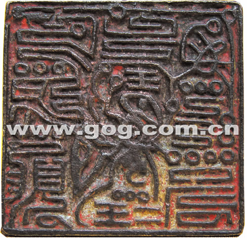 只見這枚青銅大印面為方形,邊長為5.5厘米,厚1.5厘米,高3.8厘米。印面陽刻圖文,中央有一圖形,似人非人的蝴蝶圖案;環(huán)繞圖形有三排文字,似篆非篆,大印上有長方形印把,把高6.5厘米,把上陰刻有一個“上”字形的圖案。左側(cè)是一個人名,有兩個“王”字分別在圖案的上下方,末尾的字似為篆體“總印”。印面下方左右有“多德”二字;上下各有兩個“王”字,印中間有28個圓圈符號圍繞著蝴蝶。