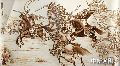 為避免干擾,王國棟把工作室設(shè)在女兒家樓房的地下室里。一塊案板,一盞臺燈,一把電烙鐵,一副老花鏡,幾本參考書,就是他創(chuàng)作的全部家當(dāng)。每天早5點(diǎn)起床,晚11點(diǎn)休息,他把全部心思都花在了烙畫上。熟讀原著,找懂三國的朋友切磋,確定故事題目,反復(fù)修改,定稿,烙繪,又是一年輪回,老王的100米長卷81個故事圖譜也出來了。為了使畫面線條更加流暢,他苦心鉆研,改革了烙鐵的銅筆頭。為了增強(qiáng)表現(xiàn)力,他嘗試著在烙畫中添加輔料來增強(qiáng)表現(xiàn)力。這些,都使《三國演義》的繪制技巧和藝術(shù)創(chuàng)作又達(dá)到了一個嶄新的高度。