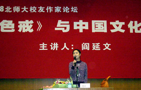日前,女作家閻延文應(yīng)母校北師大文學(xué)院邀請(qǐng),在北師大針對(duì)文化熱點(diǎn)問題,進(jìn)行了一場(chǎng)題為《色戒與中國(guó)文化》的講座。英東學(xué)術(shù)會(huì)堂,在講座開始前即已爆滿,兩個(gè)小時(shí)的講座始終處在熱烈氣氛中。