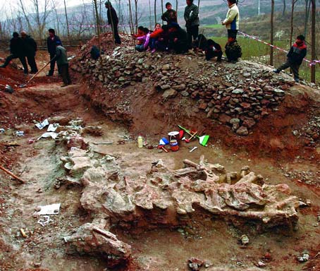但一個小學(xué)生的意外發(fā)現(xiàn),打破了郝嶺村的寧靜。“12月12日夜里,他們村的一個村民拿著一塊石頭去鄉(xiāng)政府找我們!闭诳铸埢诰颥F(xiàn)場忙活的省地質(zhì)博物館古生物研究室主任賈松海介紹說,當時他們正在汝陽縣劉店鄉(xiāng)另外一個村考察。那位找他們的村民反映說,他們那里有個小學(xué)生,這個孩子聽他同學(xué)說村里一塊坡地里有恐龍化石后,就自己偷偷挖了一小塊兒,后來,這件事被孩子的母親發(fā)現(xiàn),她又告訴了同村人。