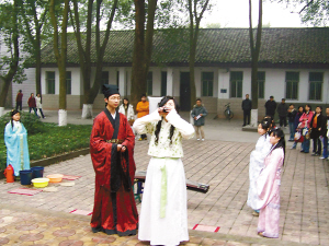 迎賓、洗爵、行拜禮……昨下午,在西南大學(xué)蜀園的孔子像前,20多個(gè)學(xué)生進(jìn)行了“鄉(xiāng)飲酒禮”儀式。他們分別扮成主人和賓客,“賓客”將酒杯舉在腰間,向“主人”鞠兩躬,“主人”作揖還禮后,“賓客”再慢慢地將杯中的米酒喝下,為了表示對(duì)“主人”的尊敬,杯里的酒不能全部喝完。隨后,他們還齊聲朗誦了《關(guān)雎》、《鹿鳴》等《詩經(jīng)》中的名篇。整個(gè)儀式持續(xù)了近2個(gè)小時(shí),將這一古老儀式的12個(gè)步驟演繹得十分逼真。