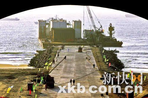 “南海I號(hào)”的登陸工作昨天繼續(xù)緊張進(jìn)行,工程人員已在半潛駁船和碼頭之間鋪好鋼板(見上圖,李小萌/攝),讓5000噸的鋼制沉箱可以一路進(jìn)入“水晶宮”內(nèi),預(yù)計(jì)古沉船將在28日正式“進(jìn)宮”。