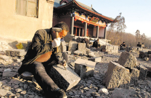 進(jìn)入山門(mén)內(nèi),一座壯觀的金頂大雄寶殿坐北朝南,院內(nèi)一片繁忙景象,50多位石匠正在用老式的打石方式,一塊一塊擊打著青石,切好的石塊被抬到大雄寶殿一東一西在建的兩座建筑上。
