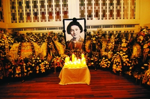 進入院門,穿過兩趟弄門,北屋門外有一幅黑底白字的挽聯(lián),上聯(lián)為“國之瑰寶一代名媛笑談春秋猶未盡”,下聯(lián)是“胸含海岳滿腔深情歷經(jīng)風(fēng)雨終不悔”,中間寫著“章含之千古”。進入設(shè)在客廳的靈堂,幾十個花圈花籃簇擁著一張章含之年輕時的黑白照片,照片里的她微微含笑;ㄈɑ@里全是鮮花,房間里散發(fā)著濃濃的百合香。擺在正中間的花籃來自她最喜愛的外孫女章冕,這也是她晚年最大的希望與寄托。