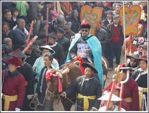 為了迎接身穿清朝官服、嘴角邊耷拉著兩撇長(zhǎng)胡須、帶著圓餅狀墨鏡的主角——“牛老爺”,村民們?cè)缭缇兔钇饋?lái)。這次耍社火,主角“牛老爺”可是從全村人中按照德貌雙全的標(biāo)準(zhǔn)篩選出來(lái)的!芭@蠣敗贝┭ゴ髅睊旃俜,裝扮成清朝官員,還騎頭大黃牛,煞是威風(fēng)。