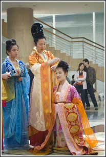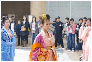 為了讓現(xiàn)代人感受傳統(tǒng)節(jié)日的文化內(nèi)涵,昨天上午9點,30余位愛好漢服文化的網(wǎng)友相聚在西安博物院,他們身著傳統(tǒng)漢服,現(xiàn)場演示古代女子的成人禮——笄禮。昨天的笄禮儀式十分莊重,因為即將行笄禮的女子是一位唐朝“公主”!肮鳌彼┓b為唐代皇室貴族的佃釵大禮衣系列,高雅華貴。