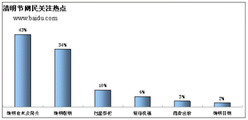 報告提供了一個有意思的結(jié)論,據(jù)百度網(wǎng)頁搜索數(shù)據(jù)顯示,在與2008年清明有關(guān)的所有關(guān)鍵詞中,網(wǎng)民最熱衷搜索清明的由來或介紹,比例高達43%。分析認為,這反映了網(wǎng)民借助清明“充電“的強烈意愿,也體現(xiàn)了網(wǎng)民對傳統(tǒng)節(jié)日的重視。