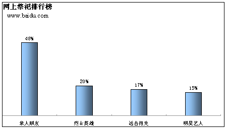 而祭祀的對象,最高的是親人朋友,占到了48%。其次是烈士英雄、遠古祖先和明星藝人,分別占20%、17%、15%。