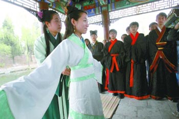兩名女大學(xué)生正在展示漢服。昨日,20多名女大學(xué)生相聚清華大學(xué),她們身著傳統(tǒng)漢服,演示了古代女子的成人禮———笄禮。女學(xué)生們進(jìn)行了三次叩拜,拜天地、拜父母、拜祖國;三次加裝,服飾一次比一次華貴,象征女子成長的過程。最后經(jīng)過上香、敬酒等多個程序,成人禮才宣告結(jié)束。笄禮是古代女子訂婚以后、出嫁之前所行的禮,目的是對她們的人生責(zé)任、社會角色進(jìn)行提醒。