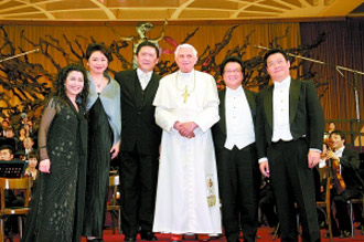 隨后,教皇走上舞臺(tái)與余隆和幾位歌唱家握手,并發(fā)表了5分鐘的演講,教皇表示昨晚的演出是一份稱(chēng)心如意的禮物,“事實(shí)上這個(gè)音樂(lè)會(huì)在某種程度上讓我們接觸到中國(guó)社會(huì)活潑輕快的現(xiàn)實(shí),在這群出色的藝術(shù)家身上,我們可以看到他們所代表的偉大中國(guó)文化和音樂(lè)傳統(tǒng),他們的演繹也幫助我們更了解一個(gè)民族的歷史”。在講話(huà)最后,教皇竟然出人意料的用中文說(shuō)出“感謝大家并祝愿大家一切順利”,并主動(dòng)邀請(qǐng)幾位藝術(shù)家一起合影,這也是教皇回贈(zèng)給中國(guó)藝術(shù)家的禮物。