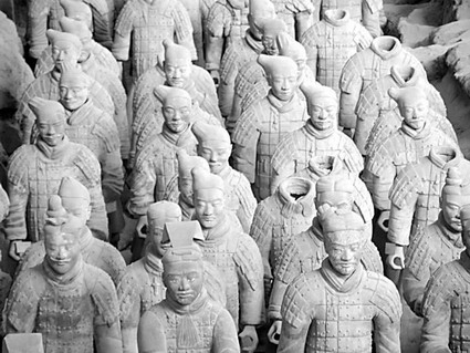 我們下面來看一些具體的藝術(shù)品。雕塑我選擇的是秦俑。這些秦俑是陪著秦始皇轉(zhuǎn)入地下,進(jìn)入歷史的,本來不會再出來了,可是,秦始皇自己絕對沒有想到,他帶入地下的這么多兵馬,過了兩千多年,忽然到地面上來了,而且還很出風(fēng)頭,不但在中國,而且在世界各地的博物館露面。這是古人絕對不能想象得到的。同時,我去參觀的時候,看到秦俑很感動,這些都是陜西人的祖先。陜西人的祖先,他們開口講話我可能不懂,第一他是陜西腔,第二他是二千年前的說話方式,聽他們說話可能今天的聽眾都要嚇一跳。說起話來,他說他的咸陽,我說我的西安,我說西安事變他也不知道是誰在變。再說他們的兵馬再強盛,用最強的弩箭來射,也絕對射不進(jìn)桃花源,射不到那個漁人的身邊。我講的是一種感慨,一種懷古,而且包含一種詮釋。