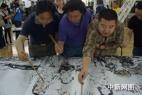 來自浙江畫院的池沙鴻等畫家共同完成向災(zāi)區(qū)遇難同胞表達(dá)哀思的作品。