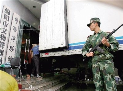 昨天,在荷槍實彈的武警押運下,包括漢代說唱俑、搖錢樹等國寶在內(nèi)的6091件文物從綿陽博物館緊急轉(zhuǎn)移到廣漢三星堆遺址博物館庫房存放。因擔心唐家山堰塞湖可能潰壩導(dǎo)致洪水毀壞文物,綿陽博物館決定緊急轉(zhuǎn)移2.5萬件文物,當天轉(zhuǎn)移了第一批。
