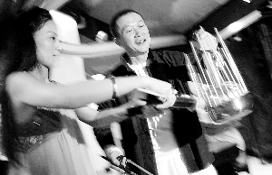 發(fā)布會上,譚盾和《茶》表演者一起演示了用紙吹奏出音符,還用紙鼓打擊出了獨特的節(jié)奏。 記者 郭延冰 攝