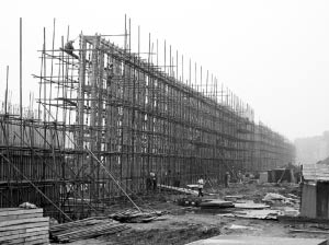 6月30日,記者在“唐山地震遺址紀(jì)念公園”的工程現(xiàn)場(chǎng)看到,盡管剛下過(guò)大雨,地上一片泥濘,但滿載沙石、物料的大貨車照舊進(jìn)進(jìn)出出,壓路機(jī)、大鏟車、小叉車也是隆隆作響。一排新建的鋼筋混凝土骨架像一道巨大的屏障,將整個(gè)工地截成南北兩塊。在它的西側(cè),已經(jīng)保存了32年的原唐山機(jī)車車輛廠鑄鋼車間地震遺址,在一層霧氣的籠罩中依舊桀驁地挺立在那里。