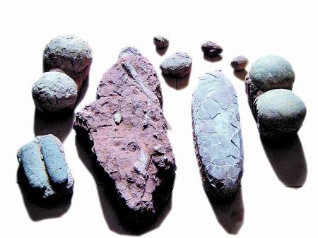 “這是村民們開山修筑趙營村至金花村‘村村通’公路時發(fā)現(xiàn)的!睆堌S臣說,“目前,僅新修公路沿線兩公里范圍內就發(fā)現(xiàn)有二十多窩這樣的恐龍蛋化石,估計實際蘊藏量不下100窩。同時還發(fā)現(xiàn)了樹枝蛋、戈壁棱柱形蛋等十多種恐龍蛋化石!痹诖宀,張豐臣向記者展示了臨時保存的修路施工中拾到的蛋化石和龍骨化石。