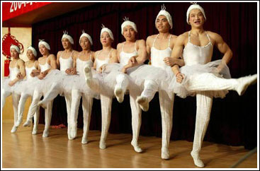 在中國男子體操隊獲得團體冠軍后,網(wǎng)上出現(xiàn)了隊員們身穿白色芭蕾服,裝扮成白天鵝,齊跳“天鵝湖”的照片,儼然是電影《出水芙蓉》中的場景。猛然看到這些照片時,以為是網(wǎng)友惡搞,后來仔細辨認,卻發(fā)現(xiàn)是男子體操隊進行聯(lián)歡時拍的,讓人爆笑不止。而更有趣的場景還出現(xiàn)在楊威的一次體操表演上,這位體操個人全能冠軍直接騎到鞍馬上,將錯就錯,把鞍馬當真馬騎,或是用力拍馬,或是顛倒方向騎,極其搞笑,也盡展其表演天賦。