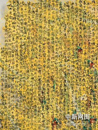 這種表現(xiàn)手法,還體現(xiàn)在文字系列的組畫(huà)上。龐舜堯是中國(guó)書(shū)法家協(xié)會(huì)會(huì)員,長(zhǎng)年抄寫(xiě)佛經(jīng),書(shū)法舒朗雋秀,富有禪意。該組繪畫(huà)由細(xì)小的《金剛經(jīng)》文字組成,將文字作為畫(huà)面的肌理,遠(yuǎn)觀是現(xiàn)代風(fēng)格的抽象畫(huà),近看則是由細(xì)小的佛經(jīng)文字組成。據(jù)龐舜堯介紹,最大的一副作品,由3萬(wàn)個(gè)工楷寫(xiě)滿(mǎn),整個(gè)創(chuàng)作持續(xù)了將近一年多的時(shí)間。