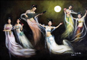 朱澤斌還講述了靈感的來源:“一輪月光照著寒冷朦朧的天空,6個仙女在廣寒宮周圍飛翔著、舞蹈著。她們身穿著宮衣、游泳衣和運(yùn)動衣組合的服飾,飛到一起來了,飛向了廣州。去年中秋節(jié)凌晨,此情此景進(jìn)入了我的夢中。第二天醒來,我把夢中見到的便作了這幅畫。”