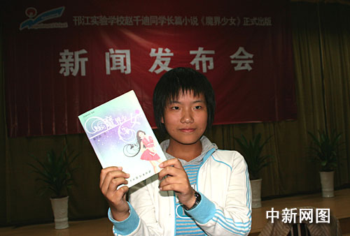 中新網(wǎng)揚州10月17日電(記者崔佳明)10月17日下午,江蘇省揚州市邗江實驗學(xué)校舉行新聞發(fā)布會,宣布該校初三學(xué)生趙千迪的十八萬字長篇小說《魔界少女》第一季終于于今年二月創(chuàng)作完成,并于八月份由中國戲劇出版社正式出版發(fā)行。揚州市作家協(xié)會主席正式宣布,吸收趙千迪入會,成為該市年齡最小的作家。