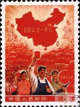 1968年9月“文化大革命”期間,全國除臺(tái)灣省外29個(gè)省、直轄市、自治區(qū)均成立了革命委員會(huì)。為紀(jì)念和慶祝這一事件,郵電部決定于1968年11月25日發(fā)行1枚“全國山河一片紅”郵票。面值8分。郵票圖案為工農(nóng)兵手持《毛主席語錄》,背景中“革命委員會(huì)”的紅旗匯成的紅色海洋和工農(nóng)兵群眾熱烈歡呼的場面,上方為一幅中華人民共和國地圖,地圖上除臺(tái)灣省外全部繪成大紅色,上面印有“全國山河一片紅”金字,郵票票幅為30毫米×40毫米,齒孔11.5度×11度,整張枚數(shù)50(10×5)。影寫版。北京郵票廠印制。集郵者稱為“一片紅”。