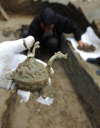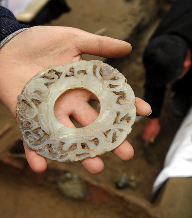 核心提示:近日,考古人員在襄樊市長虹路一建設(shè)工地進(jìn)行搶救性發(fā)掘時,發(fā)現(xiàn)一大型魏晉早期墓葬,并從該墓葬后室中發(fā)掘出玉璧、水晶珠、青銅熏爐等數(shù)十件珍貴器物。