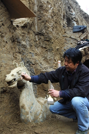 近日,考古人員在襄樊市長虹路一建設(shè)工地進(jìn)行搶救性發(fā)掘時,發(fā)現(xiàn)一大型魏晉早期墓葬,并從該墓葬后室中發(fā)掘出玉璧、水晶珠、青銅熏爐等數(shù)十件珍貴器物。專家們從出土的文物分析,該墓應(yīng)是魏晉早期的夫妻合葬墓,墓主人的身份相當(dāng)于大將軍級別。隨后,考古人員在發(fā)掘、清理前堂文物時,又發(fā)現(xiàn)了一匹與真馬體形接近的青銅馬。到昨天,整個銅馬已露出泥土80厘米高。據(jù)初步分析,銅馬高度為1.8米左右,重約2噸。
