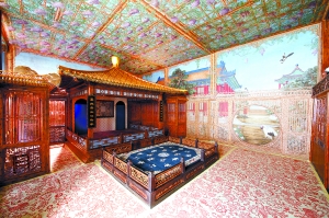 上午,記者在修復(fù)完工的倦勤齋內(nèi)看到:倦勤齋共面闊9間,以木裝修隔成了上下兩層的凹字形仙樓。最巧妙的是,齋內(nèi)各房間之間均以隔扇、檻窗、落地罩、炕罩等隔成相對獨(dú)立的空間。齋內(nèi)用歐洲透視方法繪出的絹面通景畫覆蓋了整個(gè)房間,據(jù)介紹整個(gè)倦勤齋有70余張畫,其中頂棚處有12張,全部約170平方米,如此大量反映18世紀(jì)歐洲美學(xué)對中國裝飾藝術(shù)影響的通景畫,不僅在紫禁城而且在全中國也是絕無僅有的。當(dāng)年乾隆皇帝觀戲的小戲臺被裝飾得古色古香,戲臺上方的天花板上全部都是枝藤茂密的紫羅蘭圖案通景畫,房間的墻壁上則細(xì)膩地描繪了紫禁城里的建筑和山石景色。而在以仙樓圍成的中廳內(nèi),精美的竹絲鑲嵌、玉雕和木雕藝術(shù)同樣令人嘆為觀止。