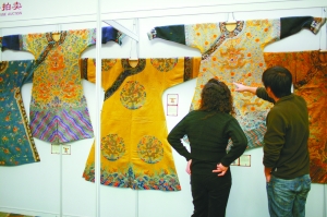 昨日展出的龍袍有明黃色、藍(lán)色、綠色;花紋包括龍紋和各種花朵圖案。雖然表面顏色已發(fā)暗,但龍袍整體良好。宗鳳英介紹,絲織品是文物中最難保存的。在故宮,如此嬌貴的文物都保存在地下文物庫(kù)中。從這些龍袍的狀況看,藏家應(yīng)該下了不少工夫!捌渲袔准c故宮所藏難分上下”,體現(xiàn)了當(dāng)時(shí)織繡、緙絲的最高技藝。