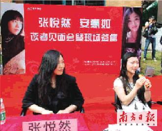 22日中午,“80后”作家張悅?cè)粩y同安意如帶著她們的作品《鯉:嫉妒》以及《惜春紀(jì)》來到廣州大學(xué)城進(jìn)行讀者見面會(huì)暨作品簽售!懊琅骷摇钡念^銜吸引了不少廣東大學(xué)生,當(dāng)天中午,簽售會(huì)現(xiàn)場(chǎng)火爆,使得原計(jì)劃12點(diǎn)半結(jié)束的簽售會(huì)延遲到了1點(diǎn)半。簽售會(huì)結(jié)束后,張悅?cè)慌c安意如接受了本報(bào)記者的采訪。