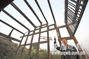 記者在現(xiàn)場看到,劉伯承舊居掩映在一片雜草中,一樓一底,面積約100平方米。屋頂是瓦片,已有一半被揭掉了,只剩下幾根碗口粗的圓木棒裸露在天空下。房間為穿斗木結構建筑,二樓的木質(zhì)窗戶雖已殘缺不全,但剩下部分仍顯出具有巴渝民間建筑特色的雕花窗格。