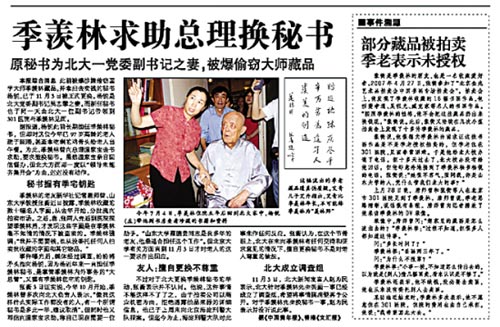 然而,有關(guān)渠道昨日披露的數(shù)段有關(guān)人士早先攝錄的季羨林視頻,畫(huà)面上思路、語(yǔ)言清晰的季老表達(dá)了對(duì)“丟畫(huà)”和北大聲明的看法,季羨林說(shuō):“(丟畫(huà))千真萬(wàn)確,我知道。當(dāng)面叫你季爺爺、季爺爺,背后偷你的畫(huà)偷畫(huà)的事情,誰(shuí)也掩蓋不了! 自稱拍得大批“季羨林珍貴書(shū)畫(huà)”的收藏家張衡10月份爆出季羨林收藏被盜賣的消息,隨后,新華社記者唐師曾在博客披露此事,季老的秘書(shū)楊銳成為被懷疑對(duì)象之一。11月初,北大給季老增派助手并成立調(diào)查組。隨后幾天,北大發(fā)表聲明:外流拍賣字畫(huà)并非季老真藏,季老秘書(shū)保管的季老藏品并未外流。11月26日,北大通報(bào)調(diào)查結(jié)果:“舉報(bào)人”手中字畫(huà)全系偽作,“盜賣沒(méi)有任何根據(jù)”。
