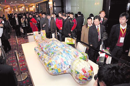 不久前,國內(nèi)的金融界人士匯聚北京,但在會(huì)議期間,他們被現(xiàn)場一件當(dāng)代雕塑給震撼了,這是一個(gè)身長3.3米,用去1720張銀行卡、充值卡和消費(fèi)卡,使用100米銅線,完全采用漢代手工技藝制成的“金縷玉衣”,外形和1968年出土的那件文物一模一樣。據(jù)刁建中介紹,這件作品的名字叫《金縷玉衣2008》,創(chuàng)作歷時(shí)15個(gè)月,從多年收集的萬余張卡中精心挑選了1720張卡。他表示,選擇“卡”作為介質(zhì),因?yàn)榭ㄗ鳛樽髌返乃囆g(shù)元素具有廣泛的社會(huì)屬性,是對(duì)人們消費(fèi)的一種梳理和認(rèn)同。刁建中希望通過這種承載大量社會(huì)信息的卡借用金縷玉衣的形式來表達(dá)當(dāng)代的社會(huì)現(xiàn)象。