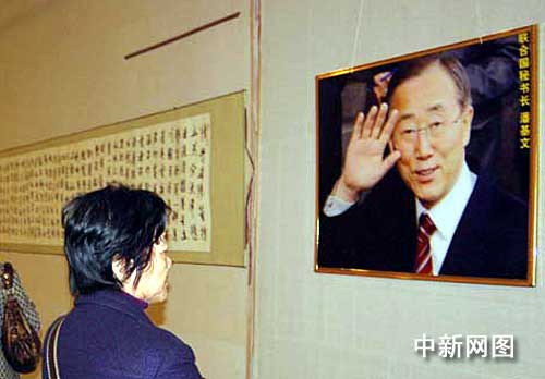 中新網(wǎng)南寧1月11日電(記者 劉萬強)聯(lián)合國秘書長潘基文“亮相”中國廣西博物館正在舉行的2009年潘氏迎春書畫藝術(shù)作品展上,在該項展覽中,潘基文作為潘氏名人,他的兩幅照片被掛在展廳內(nèi)的顯著位置。