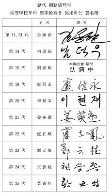 早報記者昨天在韓國“全國漢字教育推進總聯(lián)合會”網(wǎng)站看到,簽名的包括較早的韓國國務(wù)總理金鐘泌(第11屆和第31屆)、盧信永(第18屆)、李賢宰(第20屆)、盧在鳳(第22屆)、鄭元植(第23屆)以及高建(第30屆、第35屆)、李海瓚(第36屆)、韓明淑(第37屆)、韓德洙(第38屆)。